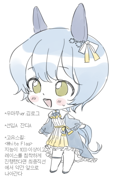 +뭔가 소심&겁많은 성격이라 선두에서 뛰는 각질은 아닐것같아서 선입으로(추입B정도)... 뒤쪽에 머무르다가 막판에 뒷심발휘하는게 어울림ㅋㅋㅋ 잔디는 걍 내가 잔디가 좋으니까 ㅋㅋ 아 거리를 안썼구나 장거리일수록 스태미나, 단거리일수록 근성.... 김로그에게 스태미나와 근성 중 무엇이 어울리는가........../고뇌